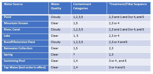 In cases where water source is heavily laden with multiple contaminants, it may be necessary to filter the water twice, changing filter types between treatments based on the table above.